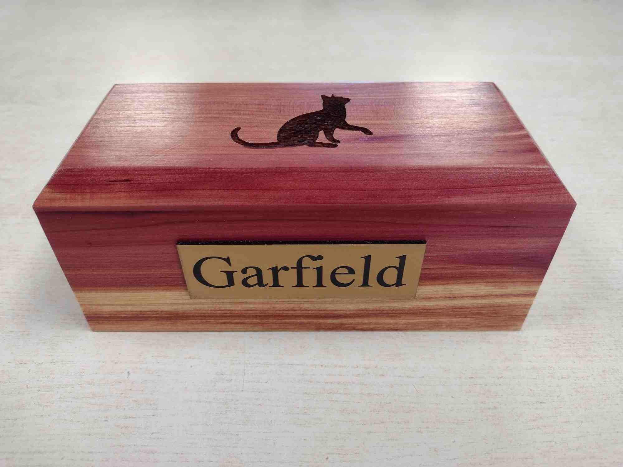 Beautiful hand-crafted cedar urn available just for our feline friends. This is available in one size but with varying natural colors. It comes with a personalized nameplate with your choice of inscription. The image of a cat is laser etched onto the top of the urn at the factory and is not customizable.